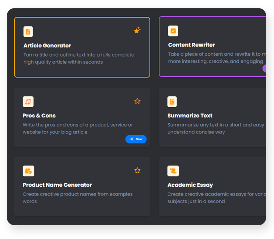 Choisissez parmi un large éventail d'outils d'IA pour rédiger des publicités sur les médias sociaux, des sections de héros, des articles de blog, des essais, etc.